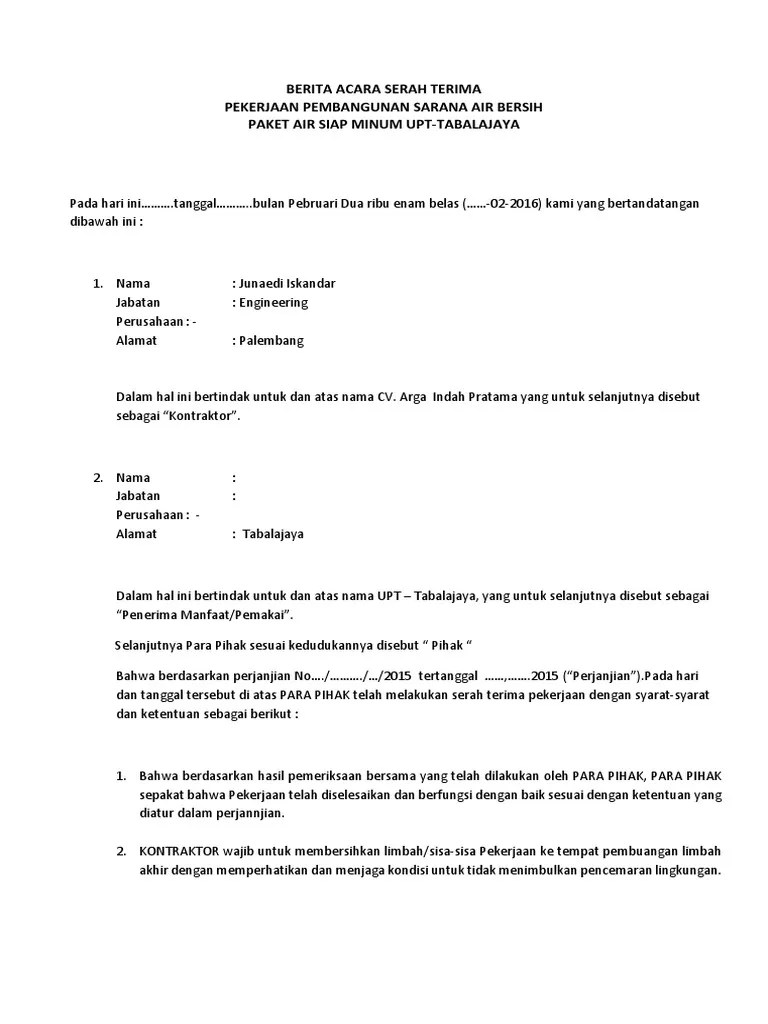 Berita acara serah terima hasil pekerjaan konstruksi ini dibuat pada hari ini, ______ tanggal __. Iii.3 iii.4 iii.5 panitia serah terima kontraktor pelaksana unsur proyek i.1 … 20050105 berita acara serah terima akhir pekerjaan 2 doc contoh surat berita acara serah terima pekerjaan resmi nekopencil contoh berita . Download & view berita acara serah terima pekerjaan pekerjaan pasang crane as pdf for free. Bast (berita acara serah terima).
